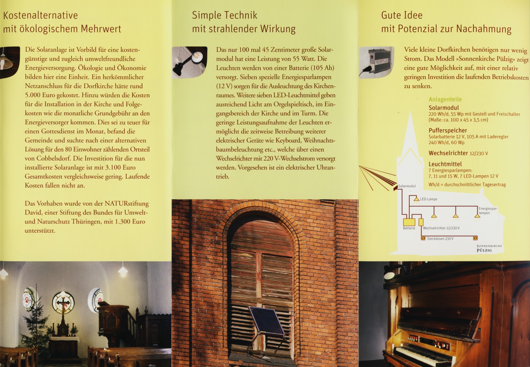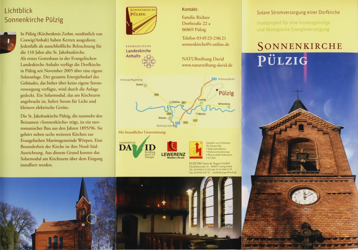 Seit November 2005 verfügt die Pülziger St. Jakobuskirche über eine Solaranlage zur Stromversorgung. Aus diesem Anlass wurde der hier abgebildete Flyer erstellt. Für mehr Infos zur Pülziger Kirche und Solaranlage senden Sie bitte eine Mail an: sonnenkirche@t-online.de